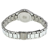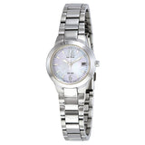 Stainless steel case with a stainless steel bracelet. Fixed stainless steel bezel. White mother of pearl dial with silver-tone hands and stick hour markers. Arabic numerals mark the 6 and 12 o'clock positions. Minute markers around the outer rim. Dial Type: Analog. Luminescent hands and markers. Date display at the 3 o'clock position. Quartz movement. Scratch resistant mineral crystal. Pull / push crown. Solid case back. Case size: 26 mm. Case thickness: 9 mm. Round case shape. Band width: 14 mm. Deployment clasp with a push button release. Water resistant at 100 meters / 330 feet. Functions: date, hour, minute, second. Dress watch style. Watch label: Made in Japan. Item Variations: EW1670 59D, EW1670.59D, EW167059D. Citizen Silhouette Eco-Drive Mother of Pearl Dial Stainless Steel Ladies Watch EW1670-59D.