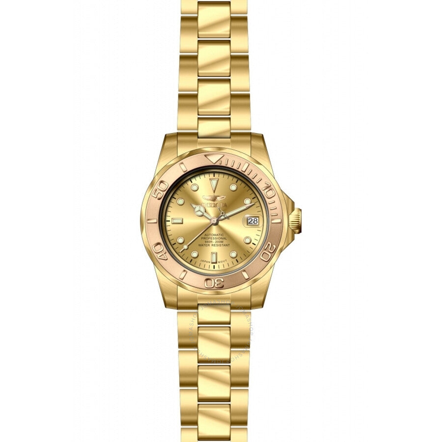 Yellow gold PVD stainless steel case and bracelet. Fixed yellow gold PVD bezel with a rose gold-tone ring. Gold dial with luminous yellow gold-tone hands and dot hour markers. Minute markers around the outer rim. Dial Type: Analog. Luminescent hands and markers. Date display at the 3 o'clock position. SII caliber NH35A automatic movement, containing 24 Jewels, bitting at 21600 vph, and has a power reserve of approximately 41 hours. Scratch resistant mineral crystal. Screw down crown. Skeleton case back. Round case shape. Case size: 40 mm. Case thickness: 14 mm. Band width: 20 mm. Band length: 8.5 inches. Deployment clasp with a push button release. Water resistant at 200 meters / 660 feet. Functions: date, hour, minute, second. Pro Diver Series. Casual watch style. Watch label: Japan Movt. Invicta Pro Diver Automatic Gold Dial Men's Watch 13930.