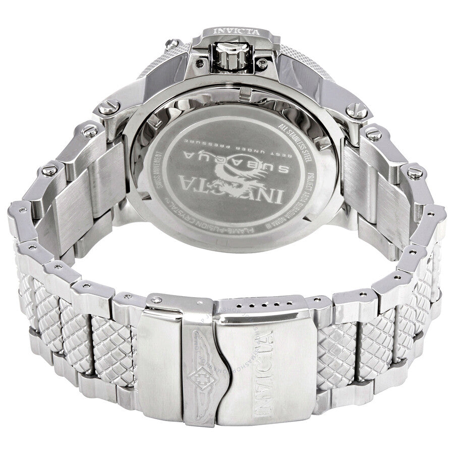 Stainless steel case with a stainless steel bracelet. Uni-directional rotating stainless steel bezel. Gunmetal dial with luminous silver-tone hands and index hour markers. Minute markers. 24 hour markers around the outer rim. Dial Type: Analog. Luminescent hands and markers. Date display at the 3 o'clock position. Caliber 515.24H quartz movement. Scratch resistant flame fusion crystal. Screw down with a hinged protector crown. Solid case back. Case size: 50 mm. Case thickness: 18 mm. Round case shape. Band width: 29 mm. Band length: 8.25 inches. Deployment clasp with a push button release. Water resistant at 500 meters / 1650 feet. Functions: GMT, date, second time zone, hour, minute, second. Additional Info: in general, suitable for short periods of recreational swimming, but not diving or snorkeling. Casual watch style. Watch label: Swiss Made. Invicta Subaqua GMT Gunmetal Dial Men's Watch 21727.
