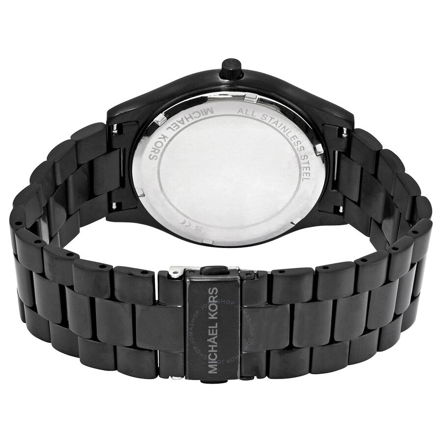 Black-plated stainless steel case and bracelet. Fixed black-plated bezel. Black dial with red hands and index hour markers. Dial Type: Analog. Quartz movement. Scratch resistant sapphire crystal. Pull / push crown. Solid case back. Round case shape. Case size: 44 mm. Case thickness: 10 mm. Band width: 22 mm. Fold over clasp with a safety release. Water resistant at 50 meters / 165 feet. Functions: hour, minute, second. Slim Runway Series. Casual watch style. Michael Kors Slim Runway Quartz Black Dial Men's Watch MK8734.