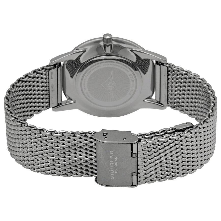 Stainless steel case with a stainless steel mesh bracelet. Fixed stainless steel bezel. Black dial with silver-tone hands and index hour markers. Roman numerals appear at the 3, 6, 9 and 12 o'clock positions. Dial Type: Analog. Quartz movement. Scratch resistant mineral crystal. Pull / push crown. Solid case back. Round case shape. Case size: 38 mm. Case thickness: 6 mm. Band width: 20 mm. Fold over slip through clasp. Water resistant at 50 meters / 165 feet. Functions: hour, minute. Symphony Series. Dress watch style. Stuhrling Original Symphony Black Dial Men's Watch M15289.