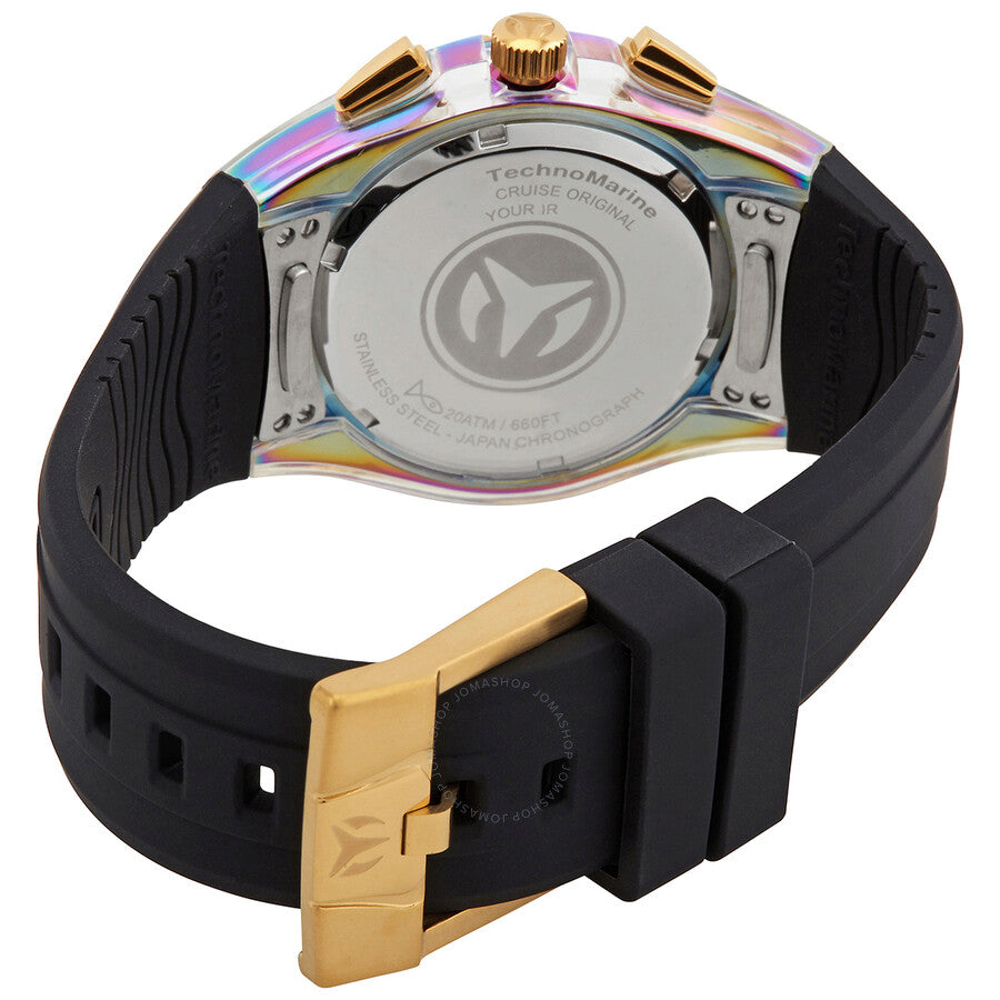 Iridescent PVD stainless steel case with a black silicone strap. Uni-directional rotating yellow gold-tone bezel. Black dial with luminous yellow gold-tone hands and index hour markers. Arabic numeral minute markers (at 5 minute intervals). Minute markers around the outer rim. Dial Type: Analog. Date display between the 4 and 5 o'clock positions. Chronograph - three sub-dials displaying: 60 second, 60 minute and 1/10th of a second. Hattori caliber VD57 quartz movement. Scratch resistant Flame Fusion crystal. Screw down crown. Solid case back. Round case shape. Case size: 45 mm. Case thickness: 13 mm. Band width: 29 mm. Band length: 7.75 inches. Tang clasp. Water resistant at 200 meters / 660 feet. Functions: chronograph, date, hour, minute, second. Cruise Series. Sport watch style. Watch label: Japan Movt. Technomarine Cruise Chronograph Quartz Black Dial Men's Watch TM-115366.