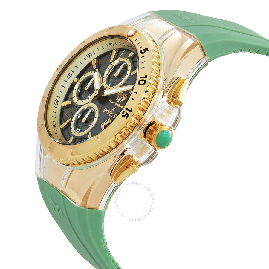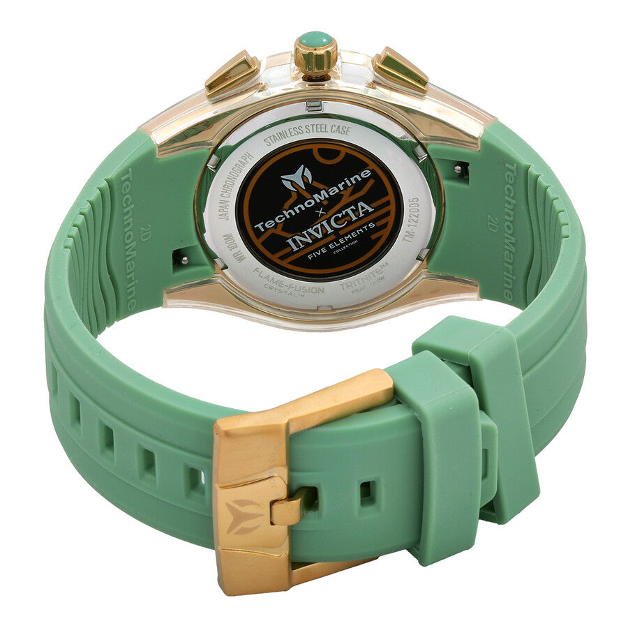 Gold-tone stainless steel case with a green, white, black silicone strap. Uni-directional rotating gold-tone stainless steel bezel. Grey dial with gold-tone hands and index hour markers. Minute markers around the outer rim. Dial Type: Analog. Date display at the 4 o'clock position. Chronograph - three sub-dials displaying: 60 second, 60 minute and 1/10th of a second. VD57 quartz movement. Scratch resistant Flame Fusion crystal. Pull / push crown. Solid case back. Round case shape, case size: 44.5 mm, case thickness: 13.3 mm. Band width: 29 mm. Buckle clasp. Water resistant at 100 meters / 330 feet. Functions: chronograph, date, hour, minute, second. Five Elements Series. Sport watch style. Watch label: Japan Movt. Technomarine Five Elements Chronograph Quartz Grey Dial Men's Watch TM-122005.
