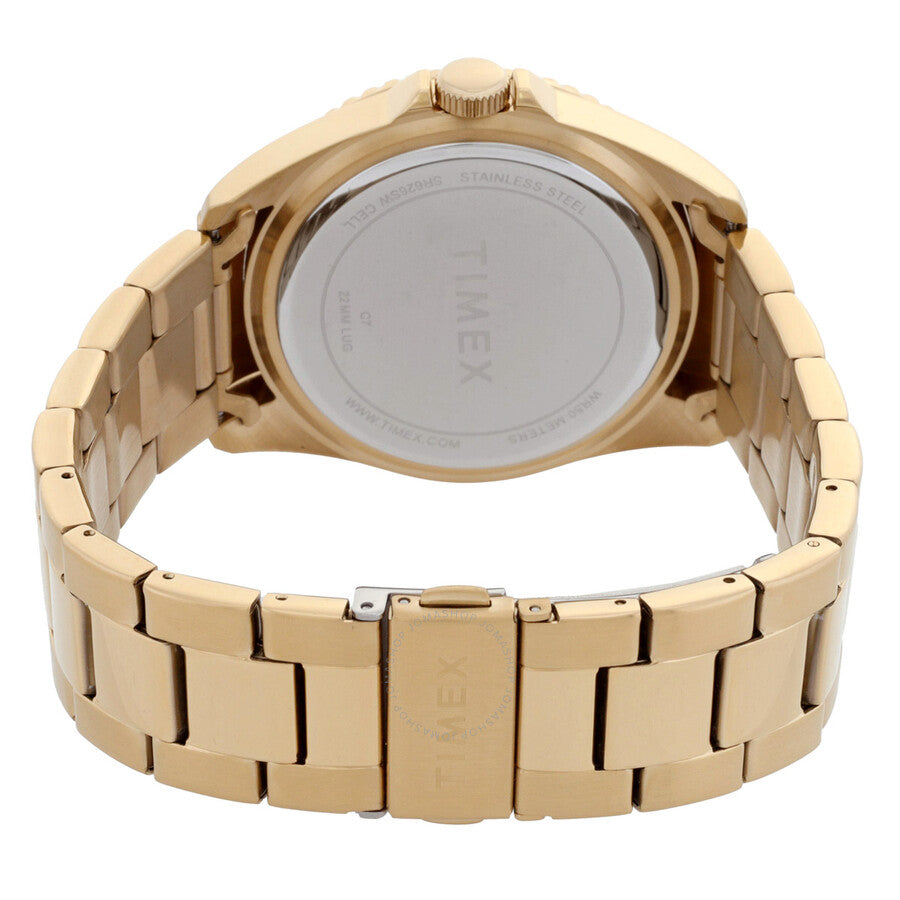 Gold-tone stainless steel case and bracelet. Black stainless steel bezel. Black dial with gold-tone hands and index hour markers. Minute scale around the inner rim. Dial Type: Analog. Luminescent hands and markers. Date display at the 3 o'clock position. Quartz movement. Scratch resistant mineral crystal. Transparent see through case back. Round case shape, case size: 42 mm. Fold over clasp with a safety release. Water resistant at 50 meters / 165 feet. Functions: date, hour, minute, second. Trend Series. Sport watch style. Watch label: Japan Movt. Item Variations: TW2W71700JT. Timex Trend Quartz Black Dial Men's Watch TW2W71700.
