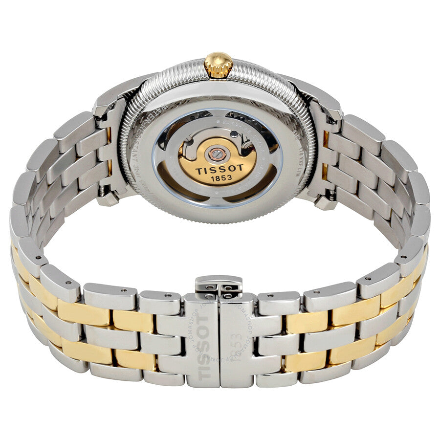 Stainless steel case with a two-tone (silver and yellow gold PVD) stainless steel bracelet. Fixed stainless steel bezel. Black dial with yellow gold-tone skeleton hands and index hour markers. Minute markers around the outer rim. Dial Type: Analog. Luminescent hands and markers. Date display between the 4 and 5 o'clock positions. Automatic movement. Scratch resistant sapphire crystal. Pull / push crown. Skeleton case back. Case size: 39.5 mm. Case thickness: 9.5 mm. Round case shape. Band width: 20 mm. Push button clasp. Water resistant at 30 meters / 100 feet. Functions: hours, minutes, seconds, date. Sport watch style. Watch label: Swiss Made. Item Variations: T97248351. Tissot Ballade III Automatic Black Dial Men's Watch T97.2.483.51.