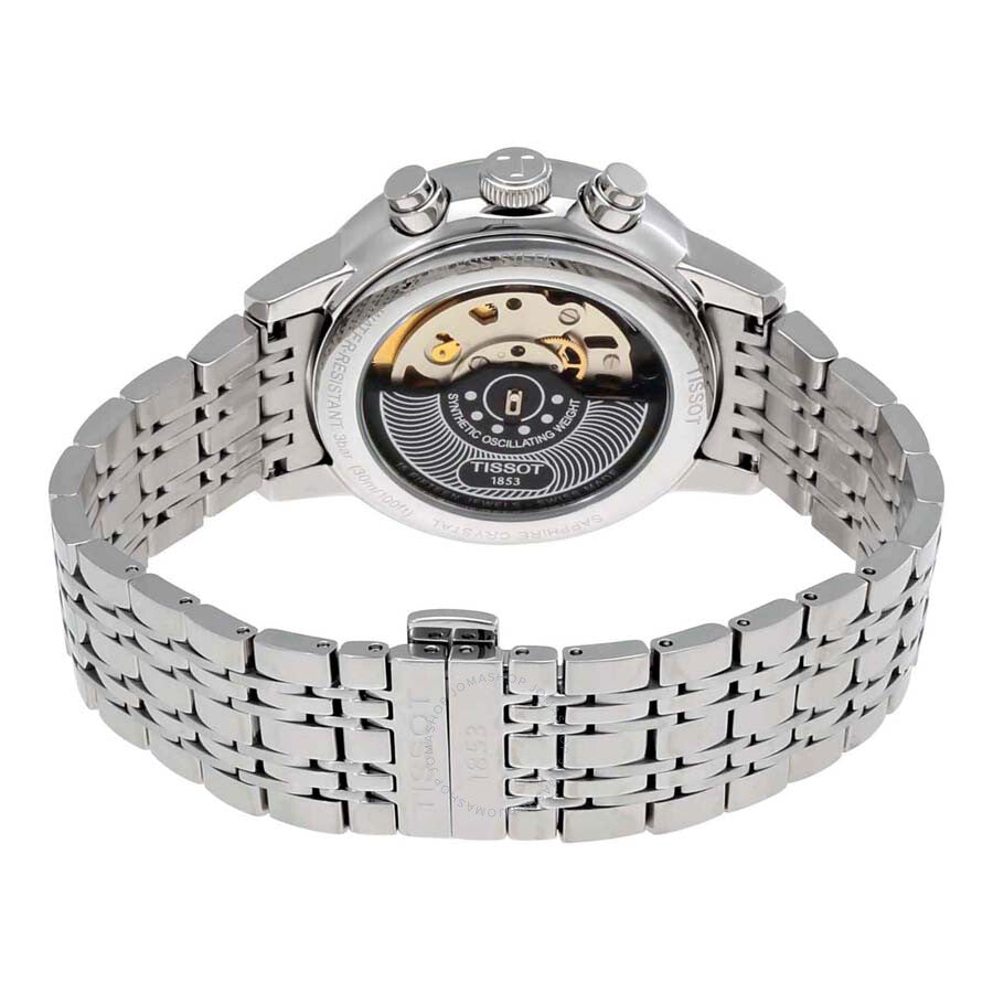 Stainless steel case with a stainless steel bracelet. Fixed stainless steel bezel. Black dial with silver-tone hands and Roman numeral hour markers. Minute markers around the outer rim. Dial Type: Analog. Date display at the 3 o'clock position. Chronograph - three sub-dials displaying: 60 second, 30 minute and 6 hour. Automatic movement with a 45-hour power reserve. Scratch resistant sapphire crystal. Skeleton case back. Case diameter: 42 mm. Case thickness: 13 mm. Round case shape. Butterfly clasp. Water resistant at 30 meters / 100 feet. Functions: chronograph, date, hour, minute, second. Casual watch style. Tissot Carson Automatic Chronograph Black Dial Stainless Steel Men's Watch T0854271105300.