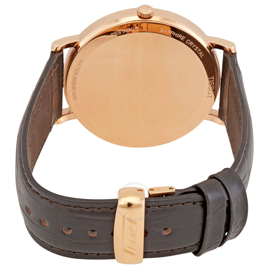 Rose gold PVD stainless steel case with a brown leather strap. Fixed rose gold PVD bezel. White dial with black hands and Arabic numeral hour markers. Minute markers around the outer rim. Dial Type: Analog. ETA caliber 902.101 quartz movement. Scratch resistant sapphire crystal. Pull / push crown. Solid case back. Round case shape. Case size: 42 mm. Case thickness: 6.45 mm. Band width: 21 mm. Butterfly clasp. Water resistant at 30 meters / 100 feet. Functions: hour, minute, second. Casual watch style. Watch label: Swiss Made. Tissot Everytime Large Quartz White Dial Men's Watch T109.610.36.012.01.