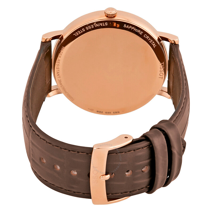 Rose gold PVD stainless steel case with a brown leather strap. Fixed rose gold PVD bezel. Silver dial with black hands and Arabic numeral hour markers. Minute markers around the outer rim. Dial Type: Analog. Quartz movement. Scratch resistant sapphire crystal. Pull / push crown. Solid case back. Round case shape. Case size: 42 mm. Case thickness: 6.5 mm. Band width: 21 mm. Tang clasp. Water resistant at 30 meters / 100 feet. Functions: hour, minute, second. Casual watch style. Watch label: Swiss Made. Tissot Everytime Large Silver Dial Men's Watch T109.610.36.032.00.