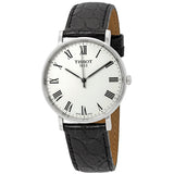 Stainless steel case with a black (calfskin) leather strap. Fixed stainless steel bezel. Silver dial with black hands and Roman numeral hour markers. Minute markers around the outer rim. Dial Type: Analog. ETA 902.101 Swiss quartz movement. Scratch resistant sapphire crystal. Pull / push crown. Solid case back. Round case shape. Case size: 38 mm. Case thickness: 6.5 mm. Band width: 19 mm. Tang clasp. Water resistant at 30 meters / 100 feet. Functions: hour, minute, second. Casual watch style. Watch label: Swiss Made. Tissot Everytime Medium Silver Dial Men's Watch T109.410.16.033.01.