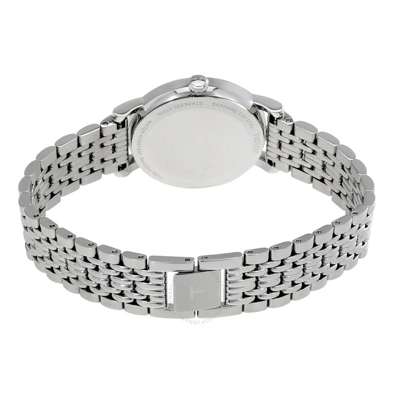 Stainless steel case with a stainless steel bracelet. Fixed stainless steel bezel. Silver dial with silver-tone hands and index hour markers. Minute markers around the outer rim. Dial Type: Analog. Tissot calibre 902.101 quartz movement. Scratch resistant sapphire crystal. Pull / push crown. Solid case back. Case size: 30 mm. Case thickness: 6.15 mm. Round case shape. Jewellery clasp. Water resistant at 30 meters / 100 feet. Functions: hour, minute, second. Casual watch style. Watch label: Swiss Made. Tissot Everytime Lady Ladies Watch T1092101103100.