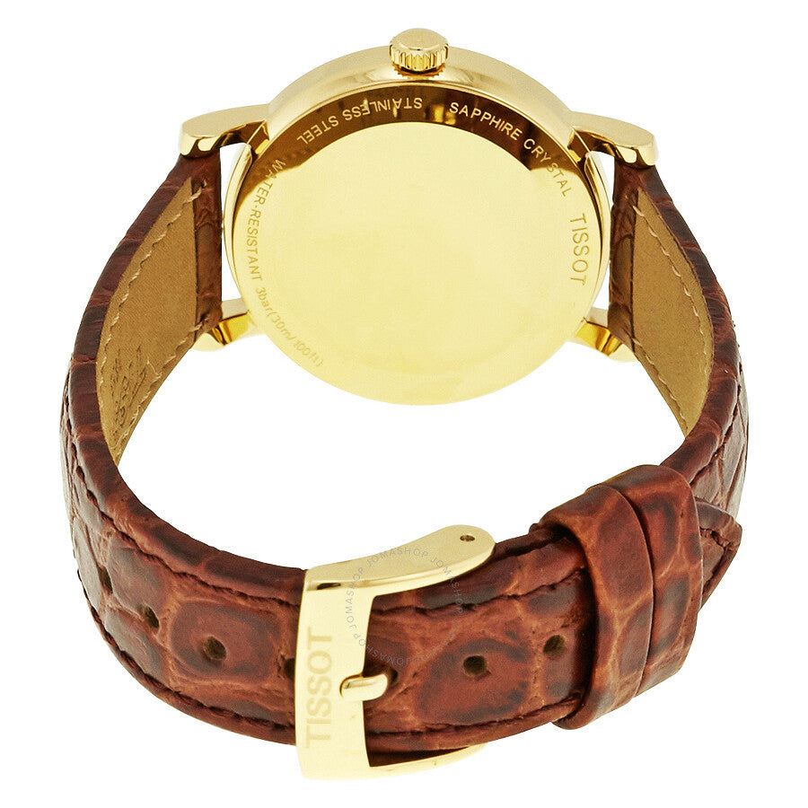 Yellow gold PVD stainless steel case with a brown (croco-embossed) leather strap. Fixed yellow gold PVD bezel. White dial with yellow gold-tone hands and index hour markers. Minute markers around the outer rim. Dial Type: Analog. ETA caliber 902.101 quartz movement. Scratch resistant sapphire crystal. Pull / push crown. Solid case back. Case size: 30 mm. Case thickness: 6.15 mm. Round case shape. Band width: 15 mm. Tang clasp. Water resistant at 30 meters / 100 feet. Functions: hour, minute, second. Dress watch style. Watch label: Swiss Made. Tissot Everytime White Dial Ladies Watch T109.210.36.031.00.