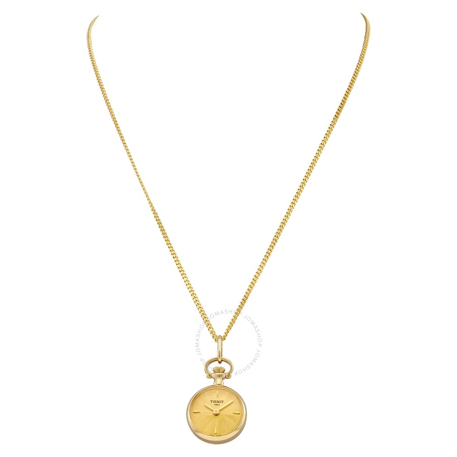 Yellow gold PVD stainless steel case with a yellow gold PVD stainless steel chain. Fixed yellow gold PVD stainless steel bezel. Gold-tone dial with yellow gold-tone hands and index hour markers. Index markers at the 3, 6, 9 and 12 o'clock position. Dial Type: Analog. Quartz movement. Scratch resistant sapphire crystal. Pull / push crown. Solid case back. Round case shape. Functions: hour, minute. Casual watch style. Watch label: Swiss Made. Tissot PENDANT/LR/Q/JAUNE/DORE 4/4 GOUTTES Watch T81421821.