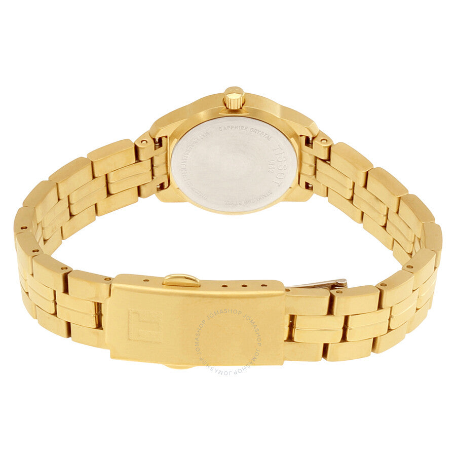 Gold-tone stainless steel case and bracelet. Fixed gold-tone bezel. Silver dial with luminous gold-tone hands and Roman numeral hour markers. Minute markers around the outer rim. Dial Type: Analog. Date display at the 3 o'clock position. Quartz movement. Scratch resistant sapphire crystal. Pull / push crown. Solid case back. Case diameter: 24.5 mm. Case thickness: 7 mm. Band width: 12 mm. Band length: 7 inches. Deployment clasp with push button release. Water resistant at 100 meters / 330 feet. Functions: date, hour, minute, second. Casual watch style. Tissot PR100 Silver Dial Ladies Watch T0492103303300.