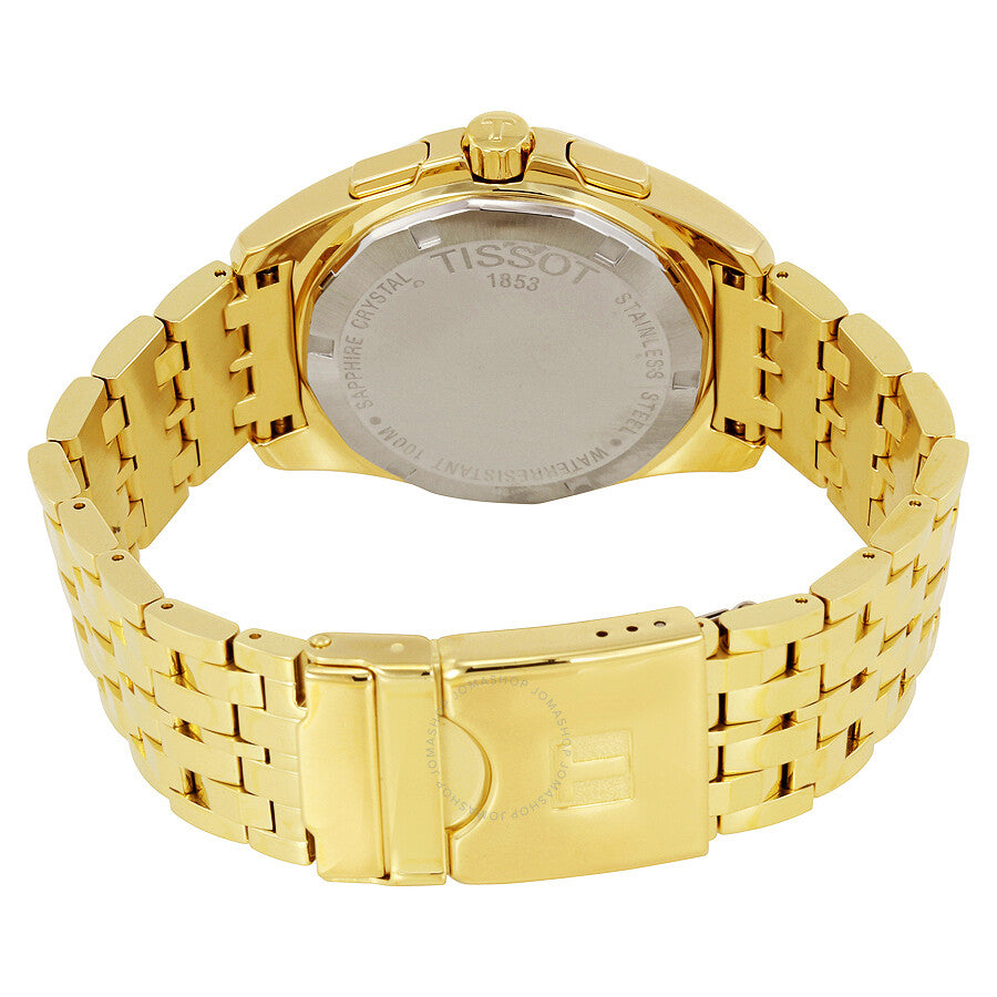 Yellow gold PVD stainless steel case with a yellow gold PVD stainless steel bracelet. Fixed yellow gold PVD stainless steel bezel. Blue dial with luminous yellow gold-tone hands and index hour markers. Minute markers. tachymeter markers around the outer rim. Dial Type: Analog. Luminescent hands and markers. Date display at the 4 o'clock position. Chronograph - three sub-dials displaying: 60 second, 30 minute and 1/10th of a second. Quartz movement. Scratch resistant sapphire crystal. Pull / push crown. Solid case back. Dodecagon case shape, case size: 40 mm, case thickness: 12 mm. Band width: 18.5 mm, band length: 8.5 inches. Fold over with safety release clasp. Water resistant at 100 meters / 330 feet. Functions: chronograph, tachymeter,date, hour, minute, second. Additional Info: suitable for snorkeling, as well as swimming, but not diving. Casual watch style. Watch label: Swiss made. Item Variations: T22568641. Tissot PRC 100 Chronograph Men's Watch T22.5.686.41.