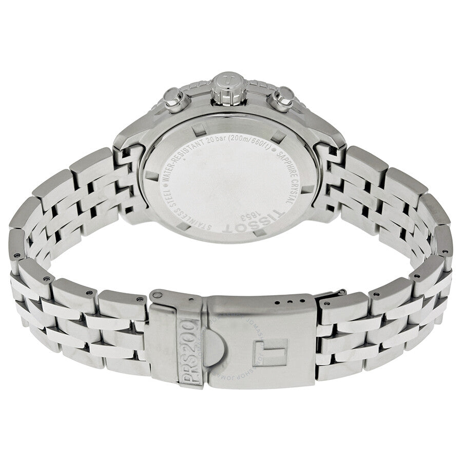 Stainless steel case with a stainless steel bracelet. Uni-directional rotating stainless steel bezel. Black dial with luminous silver-tone hands and index hour markers. Minute markers. Tachymeter markings around the outer rim. Dial Type: Analog. Luminescent hands and markers. Date display at the 4 o'clock position. Chronograph - three sub-dials displaying: 60 second, 30 minute and 1/10th of a second. G10.212 quartz movement. Scratch resistant sapphire crystal. Screw down crown. Solid case back. Case size: 42 mm. Case thickness: 12 mm. Round case shape. Band width: 19 mm. Band length: 8 inches. Deployment clasp. Water resistant at 200 meters / 660 feet. Functions: chronograph, tachymeter, date, hour, minute, second. Dress watch style. Watch label: Swiss Made. Tissot PRS 200 Chronograph Black Dial Men's Watch T067.417.11.051.01.