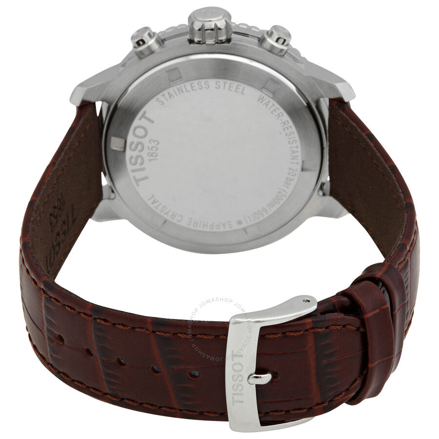 Stainless steel case with a brown leather strap. Uni-directional rotating stainless steel bezel. Blue dial with luminous yellow gold-tone hands and index hour markers. Minute markers. Tachymeter markings around the outer rim. Dial Type: Analog. Luminescent hands and markers. Date display at the 4 o'clock position. Chronograph - three sub-dials displaying: 60 second, 30 minute and 1/10th of a second. ETA caliber G10.212 quartz movement. Scratch resistant sapphire crystal. Screw down crown. Solid case back. Round case shape. Case size: 42 mm. Case thickness: 12 mm. Band width: 19 mm. Tang clasp. Water resistant at 200 meters / 660 feet. Functions: chronograph, rattrapante, date, hour, minute, small second. Prs 200 Series. Sport watch style. Watch label: Swiss Made. Tissot PRS 200 Chronograph Quartz Blue Dial Men's Watch T067.417.16.041.00.