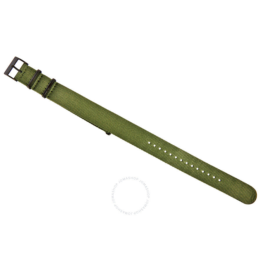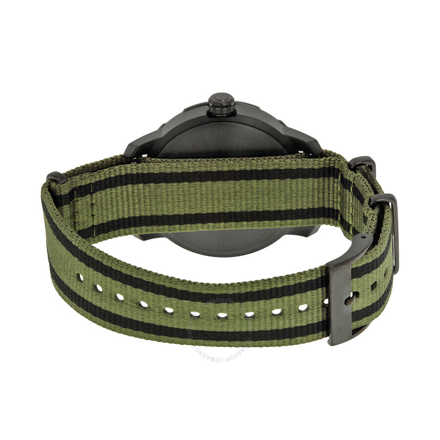 Black PVD stainless steel case with a green and black nylon strap. Fixed black PVD bezel. Black dial with silver-tone hands and index hour markers. An Arabic numeral appears at the 12 o'clock position. Minute markers around the outer rim. Dial Type: Analog. Luminescent hands and markers. Date display at the 6 o'clock position. ETA F06.111 quartz movement. Scratch resistant sapphire crystal. Screw down crown. Solid case back. Case size: 40 mm. Case thickness: 9.12 mm. Round case shape. Tang clasp. Water resistant at 100 meters / 330 feet. Functions: date, hour, minute, second. Additional Info: comes 2 with additional straps. Casual watch style. Watch label: Swiss Made. Tissot Quickster Black Dial Men's Watch T0954103705700.