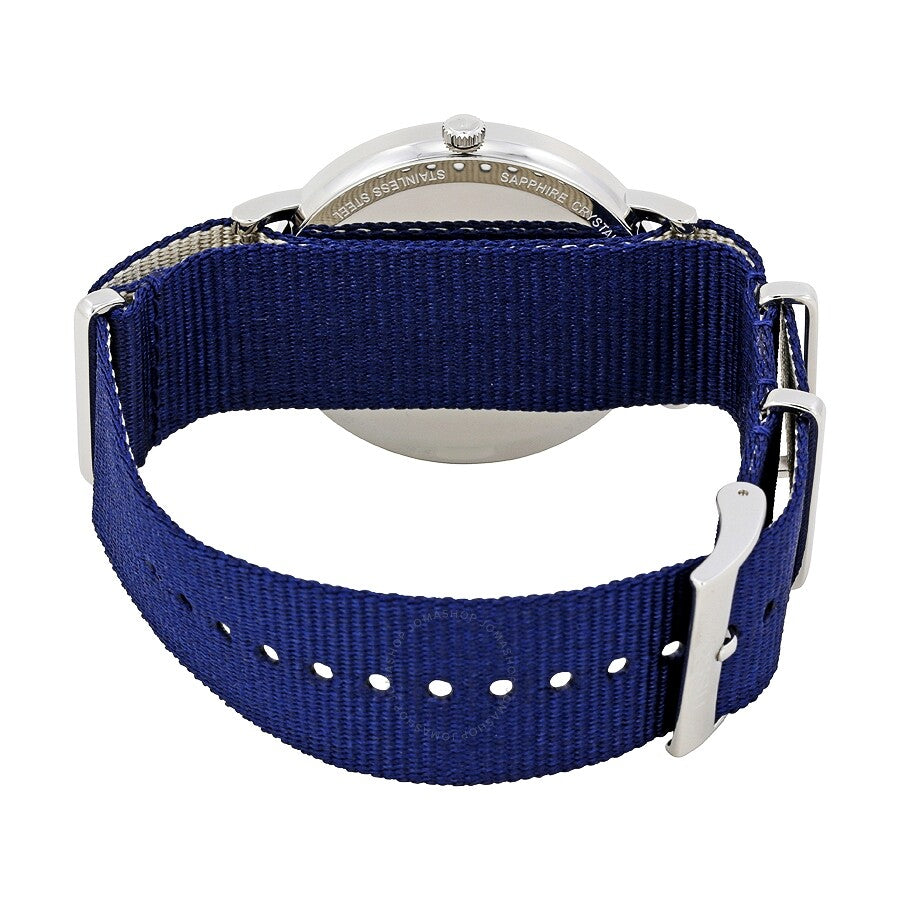Stainless steel case with a blue synthetic fabric strap. Fixed stainless steel bezel. White dial with silver-tone hands and Arabic numeral / index hour markers. Minute markers around the outer rim. Dial Type: Analog. ETA 902.101 quartz movement. Scratch resistant sapphire crystal. Pull / push crown. Solid case back. Case size: 42 mm. Case thickness: 6.45 mm. Round case shape. Strap width: 20 mm. Tang clasp. Water resistant at 30 meters / 100 feet. Functions: hour, minute, second. Casual watch style. Watch label: Swiss Made. Tissot T-Classic Everytime White Dial Men's Watch T109.610.17.037.00.