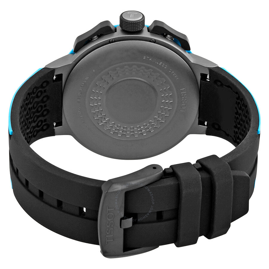 Grey PVD stainless steel case with a two-tone (black and blue) silicone strap. Fixed black PVD bezel with a blue silicone rim. Black dial with luminous blue hands and Arabic numeral hour markers. Minute markers around the outer rim. Dial Type: Analog. Luminescent hands and markers. Date display at the 4 o'clock position. Chronograph - three sub-dials displaying: 60 second, 30 minute and 1/10th of a second. ETA caliber G10.212 quartz movement. Scratch resistant sapphire crystal. Pull / push crown. Solid case back. Round case shape. Case size: 44.5 mm. Case thickness: 11.4 mm. Band width: 18 mm. Tang clasp. Water resistant at 100 meters / 330 feet. Functions: chronograph, rattrapante, date, hour, minute, small second. Sport watch style. Watch label: Swiss Made. Tissot T-Race Cycling Chronograph Black Dial Men's Watch T111.417.37.441.05.