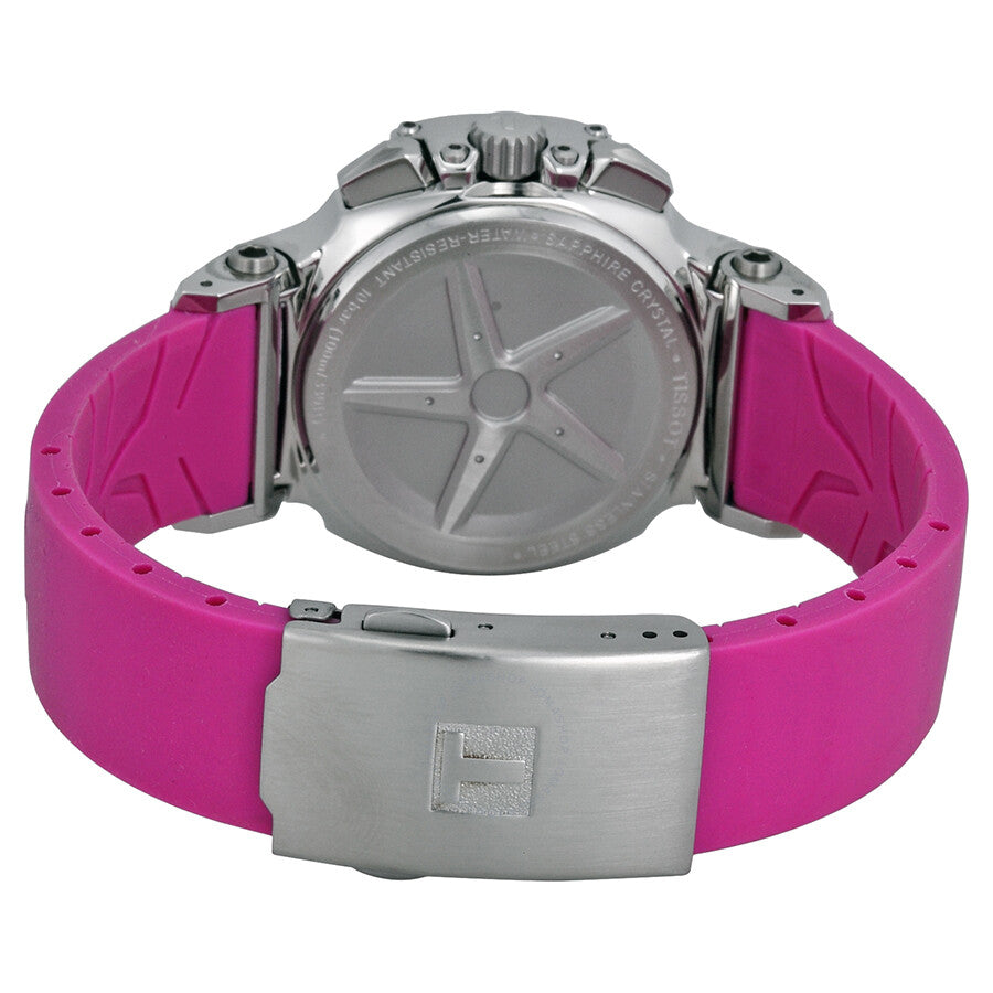 Stainless steel case with a pink rubber strap. Fixed stainless steel bezel. White dial with luminous silver-tone hands and index hour markers. Arabic numerals mark the 6, 9 and 12 o'clock positions. Minute markers. Tachymeter around the outer rim. Dial Type: Analog. Luminescent hands and markers. Date display at the 3 o'clock position. Chronograph - three sub-dials displaying: 30 minutes, 60 seconds and 1/10th of a second. Quartz movement. Scratch resistant sapphire crystal. Solid case back. Case diameter: 36 mm. Case thickness: 12 mm. Band width: 16 mm. Deployment clasp. Water resistant at 100 m / 330 ft. Functions: hours, minutes, seconds, chronograph, tachymeter, date. Sport watch style. Tissot T-RACE White Dial Pink Rubber Ladies Watch T0482171701701.
