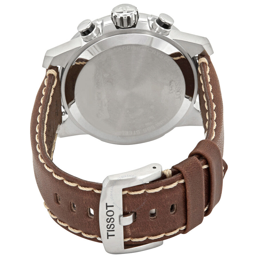 Stainless steel case with a brown leather strap. Fixed stainless steel bezel with a black aluminium ring showing tachymeter markings. Black dial with luminous silver-tone hands and index hour markers. Minute markers around the outer rim. Dial Type: Analog. Luminescent hands and markers. Date display at the 6 o'clock position. Chronograph - three sub-dials displaying: 60 second, 30 minute and 1/10th of a second. ETA caliber G10.212 quartz movement. Scratch resistant sapphire crystal. Solid case back. Round case shape. Case size: 45.5 mm. Case thickness: 11.9 mm. Band width: 22 mm. Tang clasp. Water resistant at 100 meters / 330 feet. Functions: chronograph, rattrapante, date, hour, minute, small second. T-sport Series. Sport watch style. Watch label: Swiss Made. Tissot T-Sport Chronograph Quartz Black Dial Men's Watch T125.617.16.051.01.