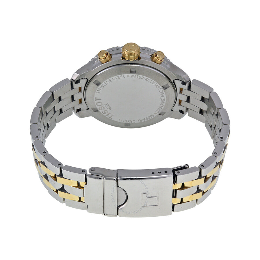 Stainless steel case with a two-tone (silver and gold-tone) stainless steel bracelet. Unidirectional stainless steel bezel. Black dial with luminous gold-tone hands and stick hour markers. Minute markers. tachymeter around the outer rim. Dial Type: Analog. Luminescent hands and markers. Date display at the 4 o'clock position. Chronograph - three sub-dials displaying: 60 seconds, 30 minutes and 1/10th of a second. Quartz movement. Scratch resistant sapphire crystal. Screw down crown. Solid case back. Case diameter: 42 mm. Band width: 11 mm. Deployment clasp. Water resistant at 200 meters / 660 feet. Functions: hours, minutes, seconds, chronograph, tachymeter, date. Tissot T-Sport PRS 200 Chronograph Black Dial Men's Watch T0674172205100.