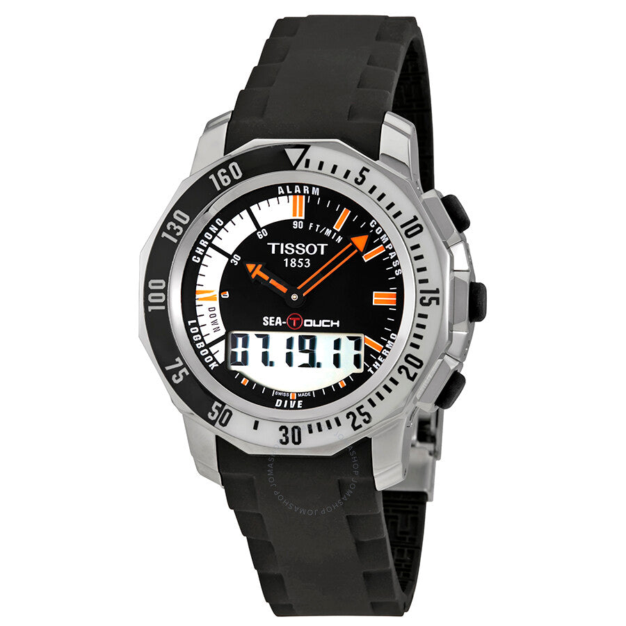 Stainless steel case with a black rubber strap. Fixed black and silver stainless steel bezel. Black dial with orange hands and index hour markers. Minute markers. Functions listed around the outer rim. Dial Type: Analog-digital. Luminescent hands and markers. Digital chronograph display. ETA caliber E48.301 quartz movement. Scratch resistant tactile sapphire crystal. Solid case back. Dodecagon case shape. Case size: 44.4 mm. Case thickness: 15.8 mm. Band width: 20 mm. Safety (diver's extension) clasp. Water resistant at 100 meters / 330 feet. Functions: alarm, comass, dive, chronograph, logbook, date, month, year, hour, minute, second. Additional Info: suitable for recreational scuba diving. Sport watch style. Watch label: Swiss made. Item Variations: T0264201728101. Tissot T-Touch Sea-Touch Men's Watch T026.420.17.281.01.