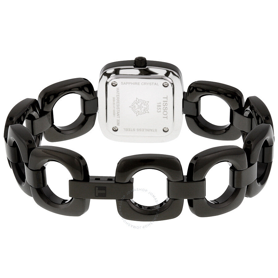 Black PVD stainless steel case and bracelet. Fixed black PVD bezel. Black dial with gold-tone hands. Index markers at the 2, 4, 6. 8, 10 and 12 o'clock positions. Dial Type: Analog. Quartz movement. Scratch resistant sapphire crystal. Pull / push crown. Solid case back. Case diameter: 27 mm. Case thickness: 8 mm. Cushion case shape. Band width: 19 mm. Jewellery clasp. Water resistant at 30 meters / 100 feet. Functions: hour, minute. Casual watch style. Watch label: Swiss made. Item Variations: T0201091105100. Tissot T-Trend Odaci-T Black Dial Black PVD Ladies Watch T0201091105100.