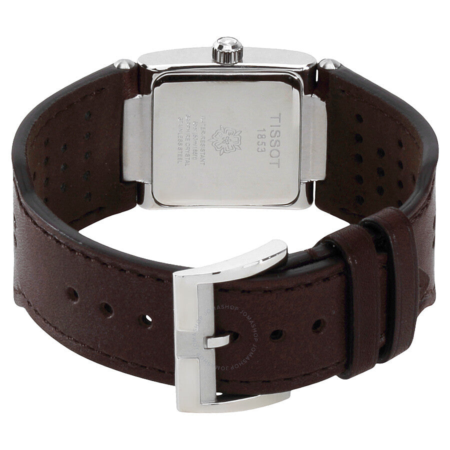 Stainless steel case with a brown leather strap. Fixed stainless steel bezel. White mother of pearl dial with silver-tone hands and index hour markers. Dial Type: Analog. Date display at the 6 o'clock position. ETA caliber F03.111 quartz movement. Scratch resistant sapphire crystal. Solid case back. Rectangle case shape. Case dimensions: 31.6 mm x 23 mm. Case thickness: 7.33 mm. Band width: 13.95 mm. Tang clasp. Water resistant at 50 meters / 165 feet. Functions: date, hour, minute. Casual watch style. Watch label: Swiss Made. Item Variations: T090 310 16 111 00, T090-310-16-111-00, T090/310/16/111/00, T0903101611100. Tissot T02 Mother of Pearl Dial Ladies Watch T090.310.16.111.00.