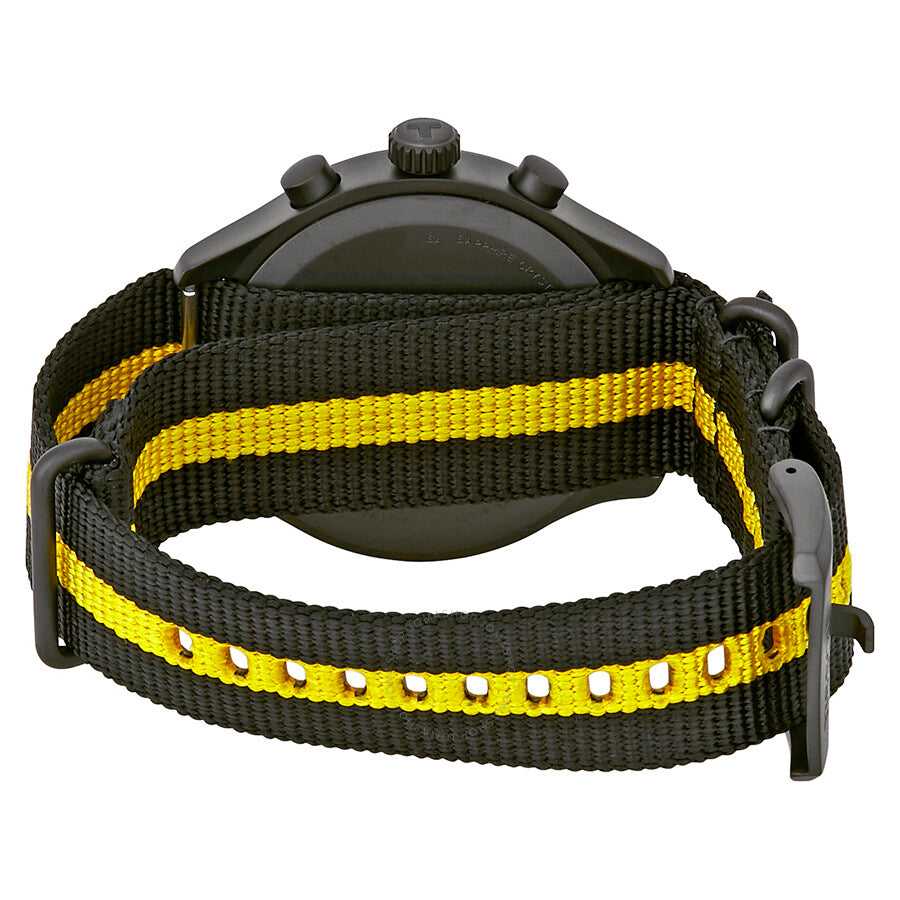 Black PVD stainless steel case with a black and yellow fabric strap. Fixed black PVD stainless steel bezel. Black dial with luminous black hands and index hour markers. Arabic numerals mark the 3, 6, 9 and 12 o'clock positions. Minute markers around the outer rim. Dial Type: Analog. Luminescent hands and markers. Date display at the 4 o'clock position. Chronograph - three sub-dials displaying: 60 second, 30 minute and 12 hours. ETA G10.212 Swiss quartz movement. Scratch resistant sapphire crystal. Solid case back. Case size: 45 mm. Case thickness: 11.02 mm. Round case shape. Band width: 22 mm. Tang clasp. Water resistant at 100 meters / 330 feet. Functions: chronograph, date, hour, minute, second. Casual watch style. Tissot XL Tour De France Chronograph Men's Watch T116.617.37.057.00.
