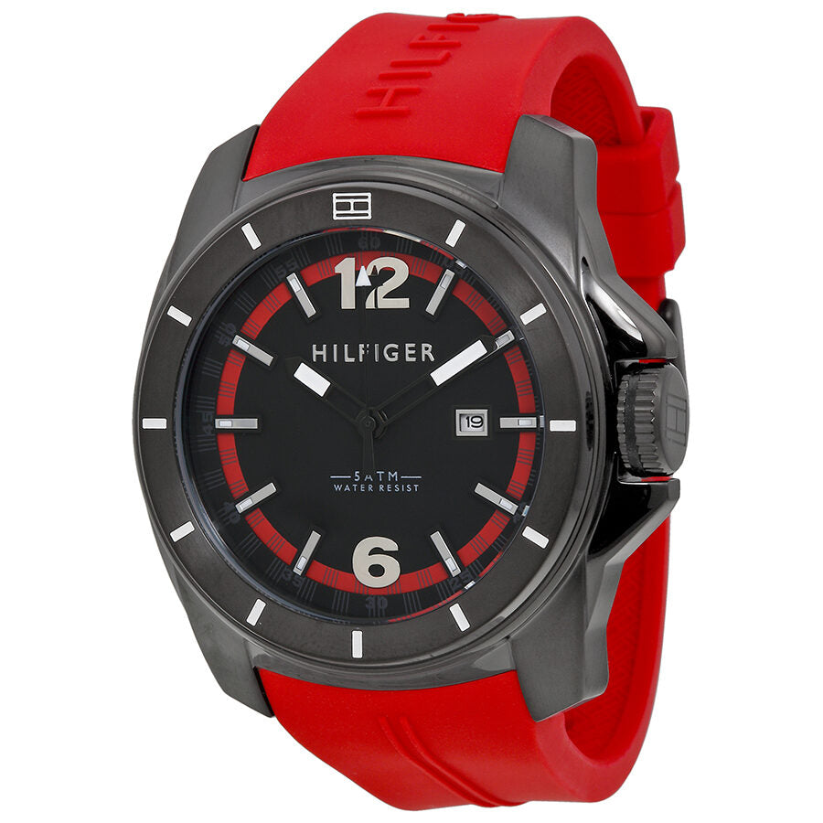 Gunmetal ion-plated stainless steel case with a red rubber strap. Uni-directional rotating gunmetal ion-plated bezel. Black and red dial with luminous hands and index hour markers. Arabic numerals mark the 6 and 12 o'clock positions. Minute markers around the outer rim. Dial Type: Analog. Luminescent hands and markers. Date display at the 3 o'clock position. Quartz movement. Scratch resistant mineral crystal. Solid case back. Case diameter: 46 mm. Case thickness: 13 mm. Round case shape. Tang clasp. Water resistant at 50 meters / 165 feet. Functions: date, hour, minute, second. Casual watch style. Tommy Hilfiger Black and Red Dial Red Rubber Men's 1791112.