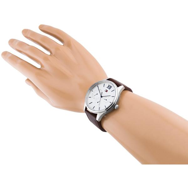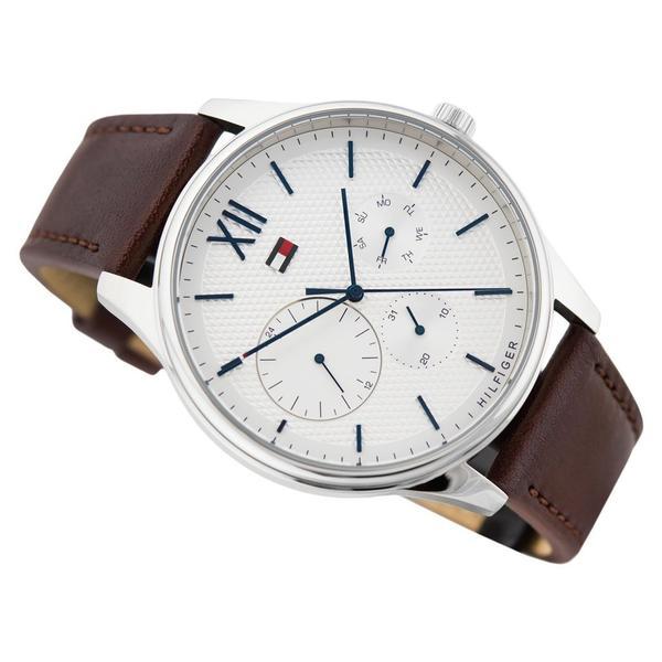 This Tommy Hilfiger Damon Chronograph Dial Men's Watch 1791418 has a stainless steel case and brown leather strap featuring a parchment, chronograph dial.