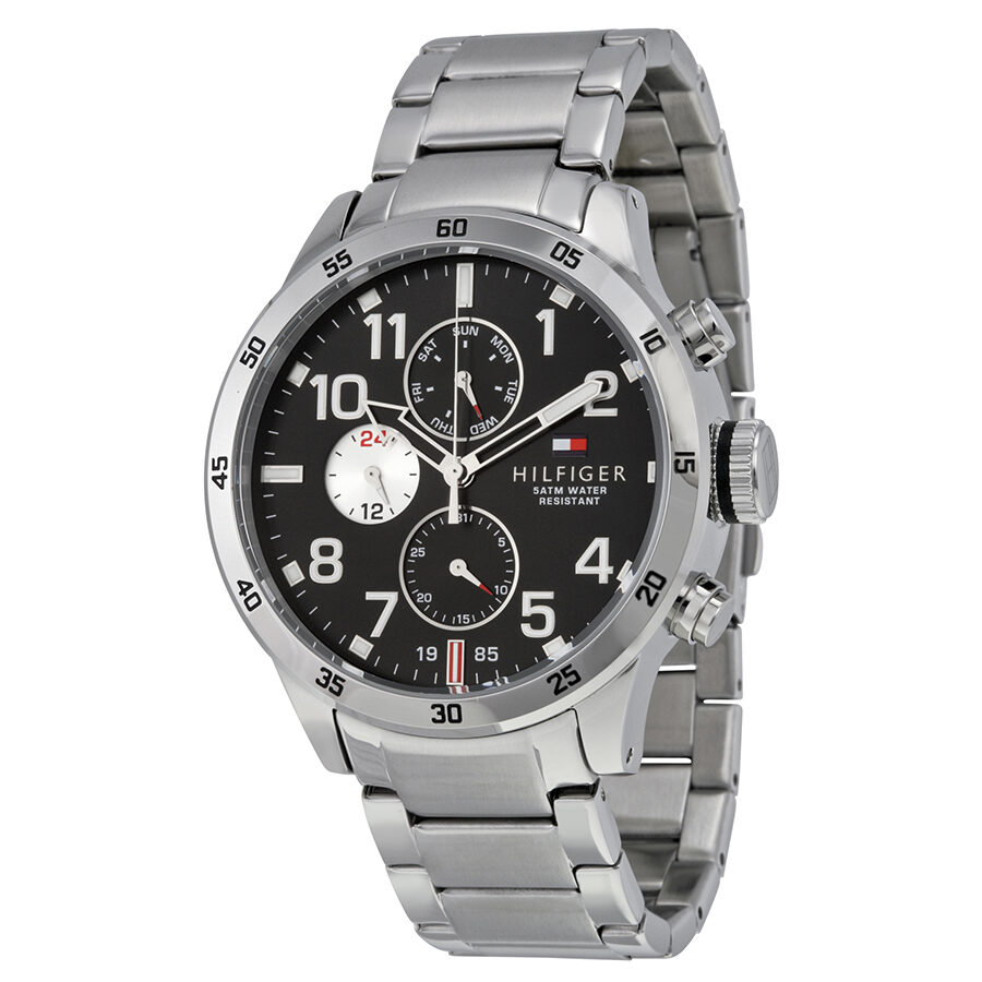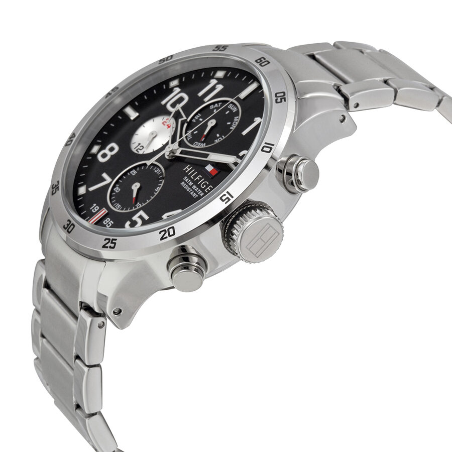 Stainless steel case with a stainless steel bracelet. Fixed stainless steel bezel. Black dial with silver-tone skeleton hands and Arabic numeral hour markers. Minute markers around the outer rim. Dial Type: Analog. Luminescent hands and markers. Three multi-function sub-dials displaying: 24 hour, date and day of the week. Quartz movement. Scratch resistant mineral crystal. Solid case back. Case diameter: 46 mm. Case thickness: 13.5 mm. Round case shape. Band width: 22 mm. Deployment clasp with push button release. Water resistant at 50 meters / 165 feet. Functions: date, day, hour, minute, second, 24 hour. Casual watch style. Tommy Hilfiger Multi-Function Black Dial Stainless Steel Men's Watch 1791141.