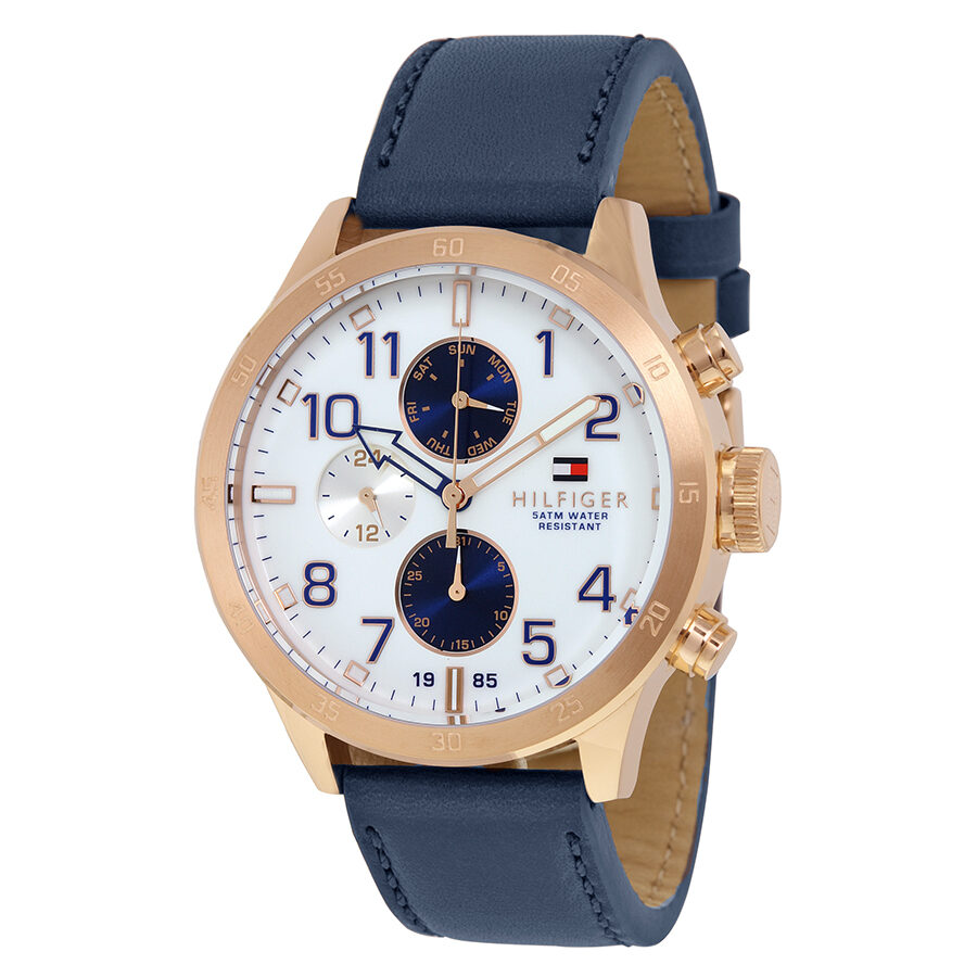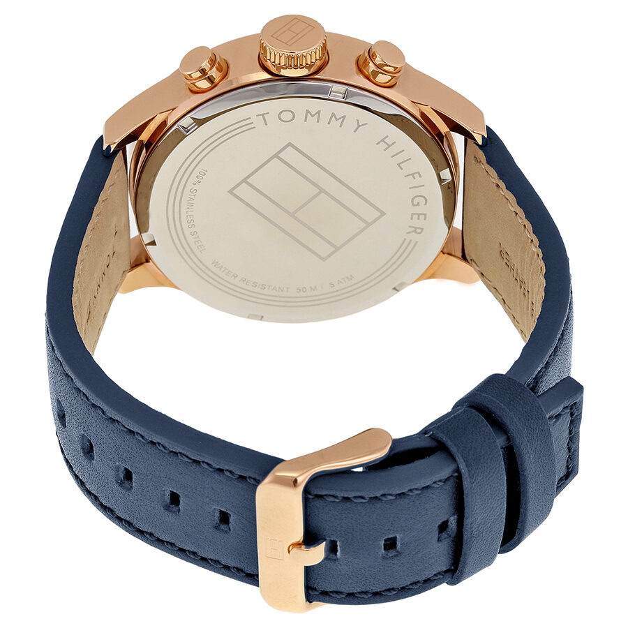 Pink gold-tone stainless steel case with a blue leather strap. Fixed pink gold-tone bezel. White dial with skeleton hands and Arabic numeral hour markers. Minute markers around the outer rim. Dial Type: Analog. Three multi-function sub-dials - 24 hour, date and day of the week. Quartz movement. Scratch resistant mineral crystal. Solid case back. Case diameter: 46 mm. Case thickness: 13 mm. Round case shape. Band width: 22 mm. Tang clasp. Water resistant at 50 meters / 165 feet. Functions: date, day, hour, minute, second, 24 hour. Casual watch style. Tommy Hilfiger Multi-Function White Dial Blue Leather Strap Men's Watch 1791139.