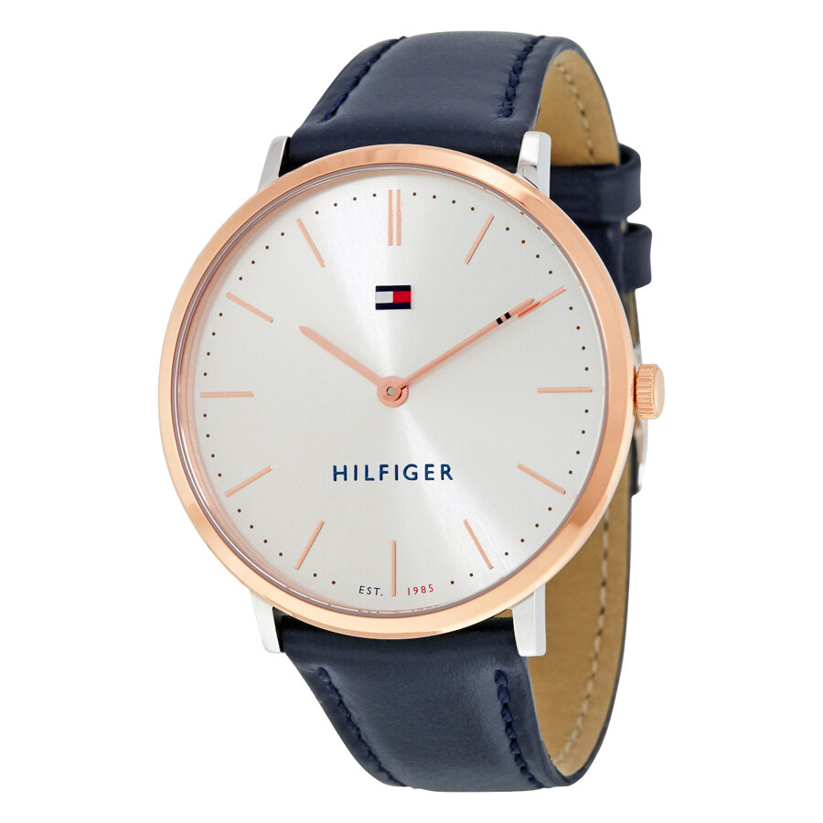 Rose gold-plated stainless steel case with a blue leather strap. Fixed rose gold-plated bezel. White dial with rose gold-tone hands and index hour markers. Minute markers around the outer rim. Dial Type: Analog. Quartz movement. Scratch resistant mineral crystal. Pull / push crown. Solid case back. Case size: 40 mm. Case thickness: 6.85 mm. Round case shape. Tang clasp. Water resistant at 30 meters / 100 feet. Functions: hour, minute,. Casual watch style. Tommy Hilfiger Ultra Slim White Dial Ladies Watch 1781689.