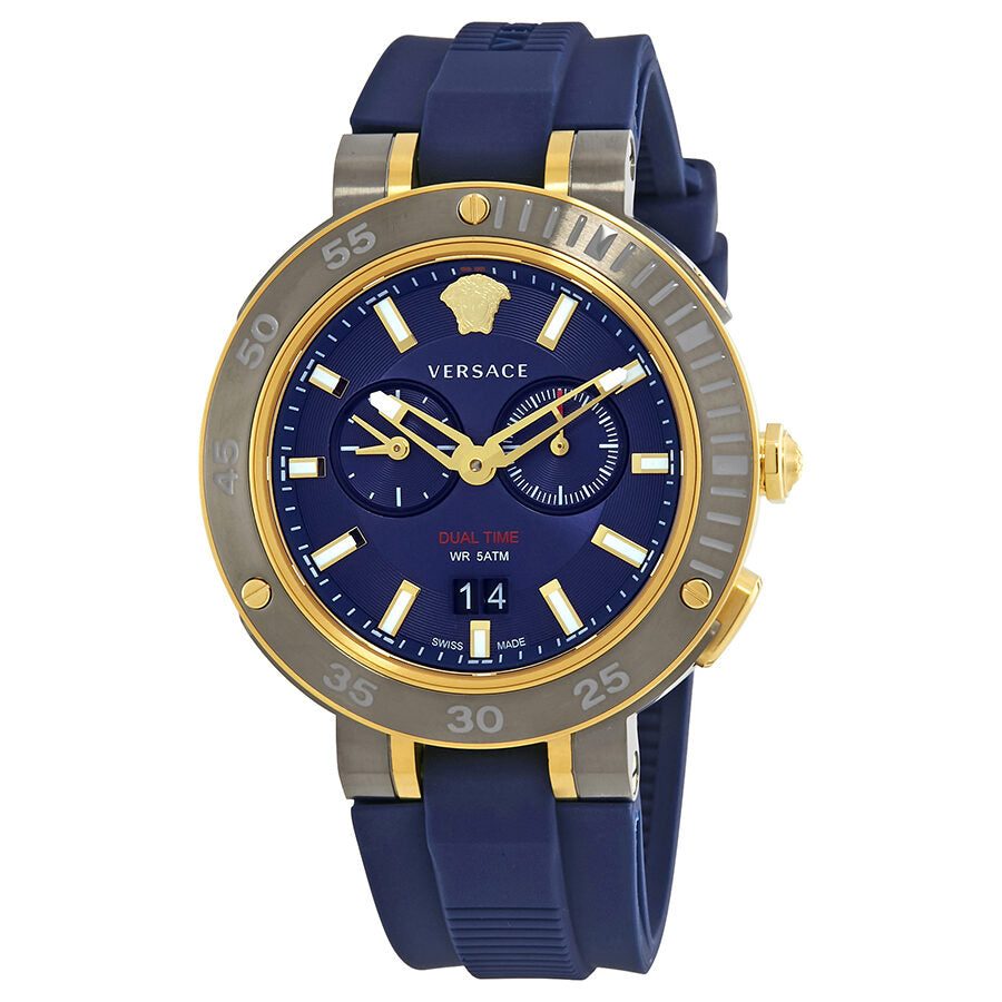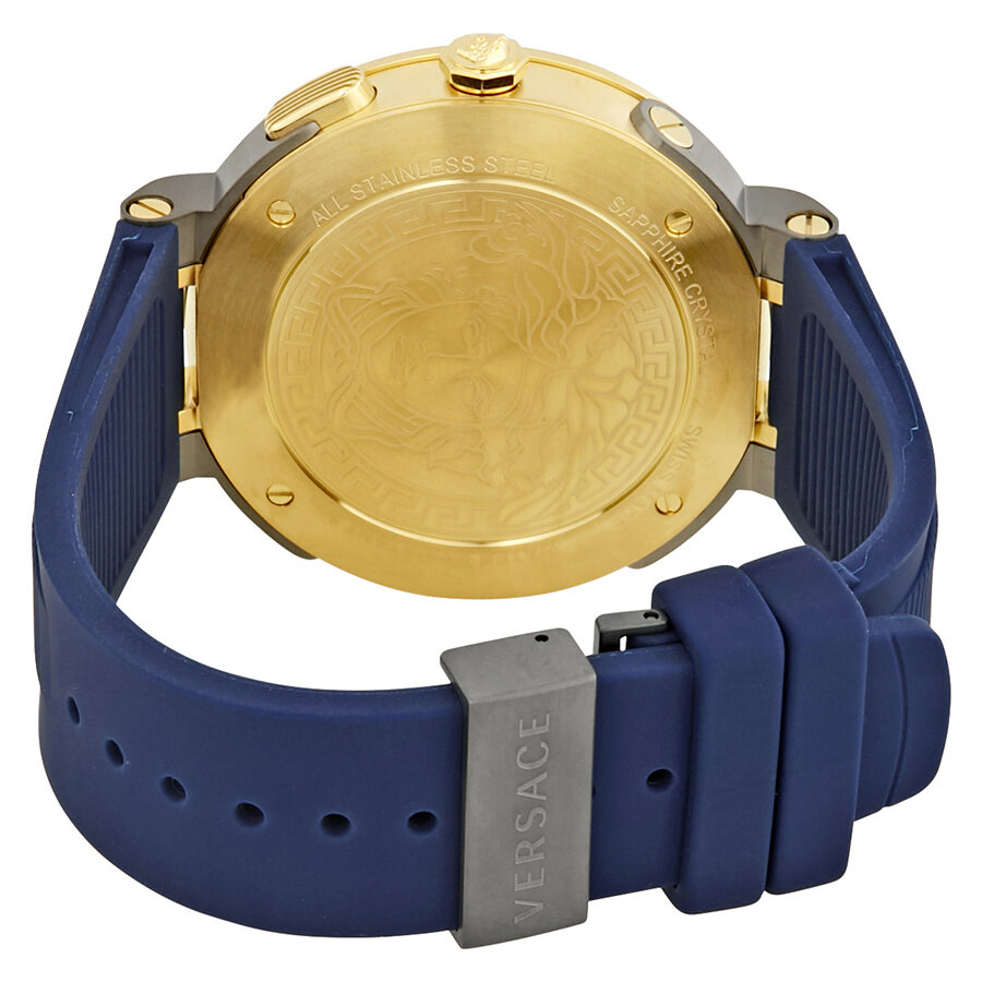 Yellow gold ion-plated stainless steel case with a blue silicone rubber strap. Yellow gold ion-plated bezel with interchangeable top rings. Blue dial with luminous yellow gold-tone hands and index hour markers. Minute markers around the outer rim. The Medusa Head logo appears at the 12 o'clock position. Dial Type: Analog. Luminescent hands and markers. Date display at the 6 o'clock position. Chronograph - two sub-dials displaying: small seconds and 12 hour/60 minute. Quartz movement. Scratch resistant sapphire crystal. Solid case back. Round case shape. Case size: 46 mm. Case thickness: 12 mm. Band width: 20 mm. Special buckle clasp. Water resistant at 50 meters / 165 feet. Functions: date, GMT, second time zone, hour, minute, second. Sport watch style. Watch label: Swiss Made. Versace V-extreme Blue Dial Men's Watch VCN010017.