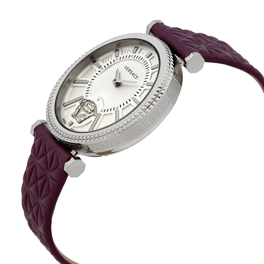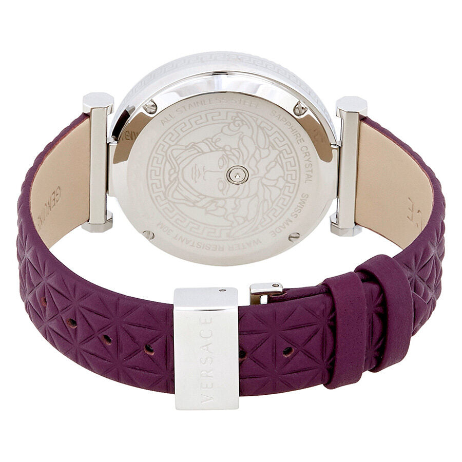 Silver-tone stainless steel case with a purple leather strap. Fixed bezel. Ivory dial with silver-tone hands and index hour markers. Minute markers around the inner ring. Dial Type: Analog. Quartz movement. Scratch resistant sapphire crystal. Case size: 38 mm. Round case shape. Deployment clasp. Water resistant at 30 meters / 100 feet. Functions: hour, minute. Dress watch style. Watch label: Swiss Made. Versace V-Helix Ivory Dial Leather Ladies Watch VQG010015.